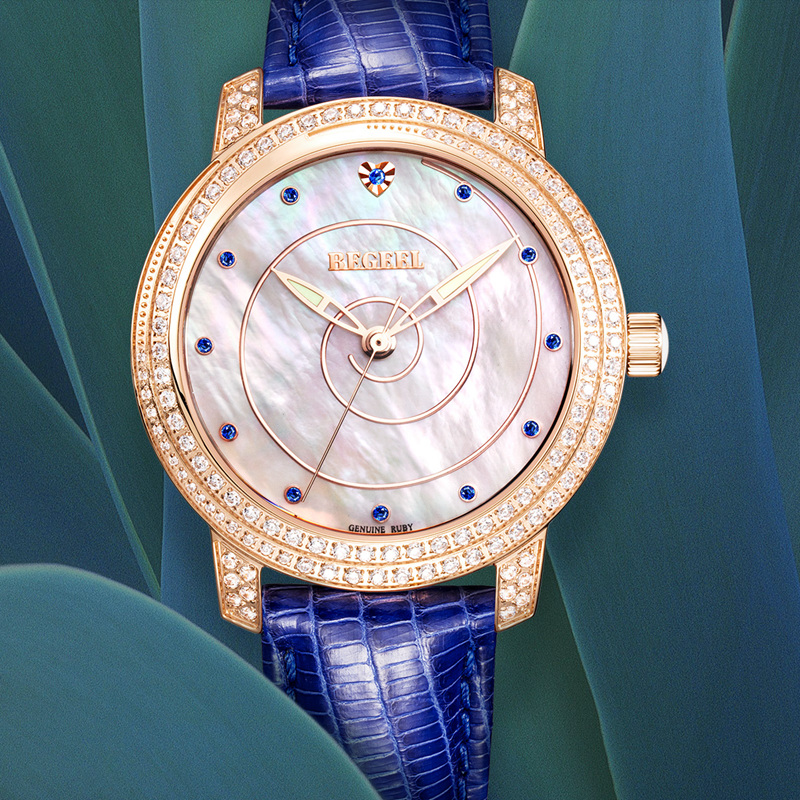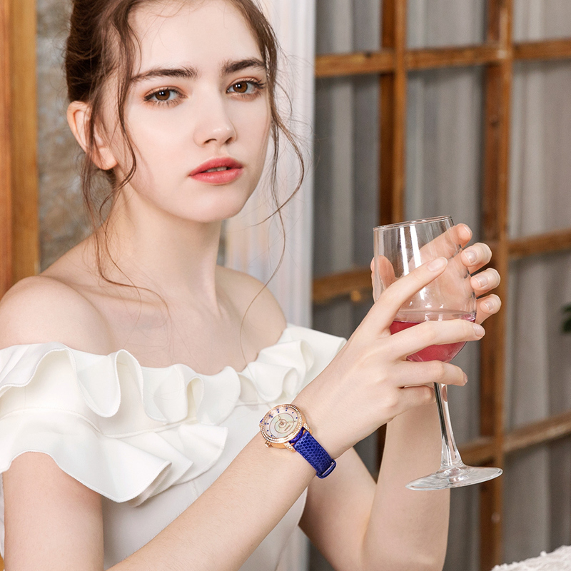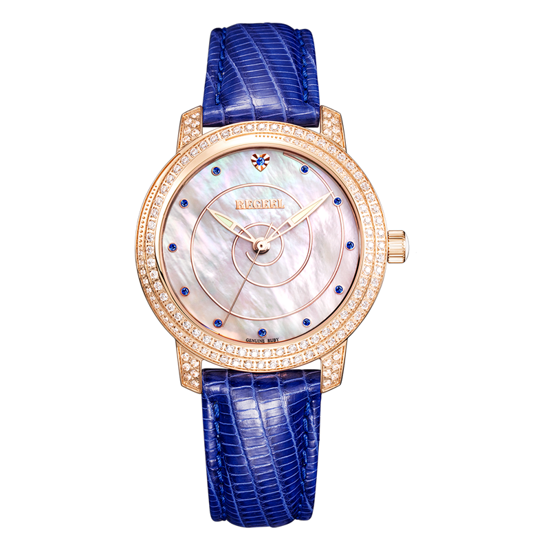 COLLECTION·珍藏系列-靈感來源于藝術體操中飛舞的絲帶,時而柔美時而輕盈飄逸,以螺旋概念為設計主題,運用鉆石、珍珠貝母,由表面中間向外旋轉布陣,表殼鑲100粒水鉆,配襯紅色寶石時刻,藍色阿拉伯數(shù)字刻度,用絲帶的婉約去碰撞珍珠母貝與滿天星水鉆,鉆石形成的螺旋形圖案更加矚目。優(yōu)雅風范,展現(xiàn)女性柔美。