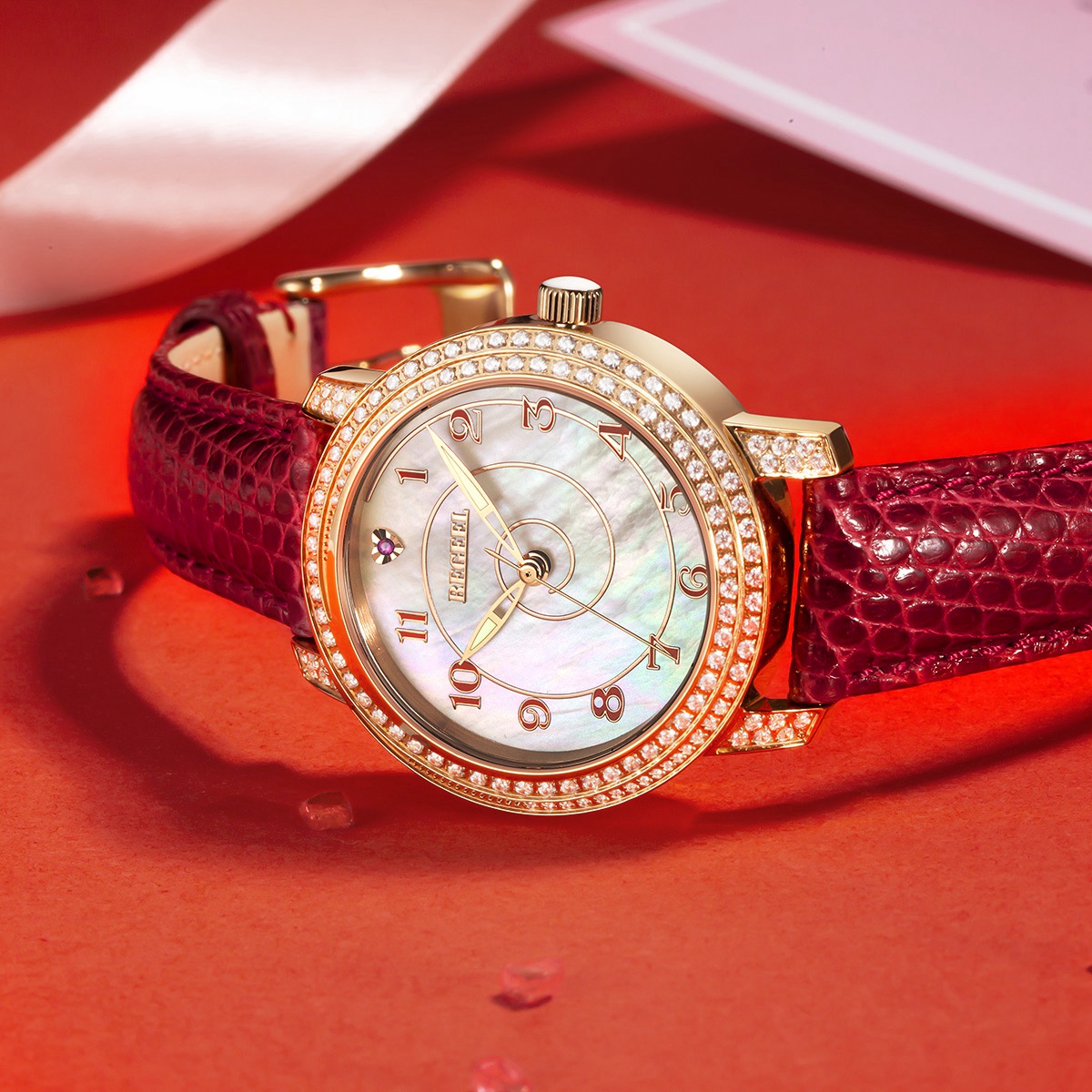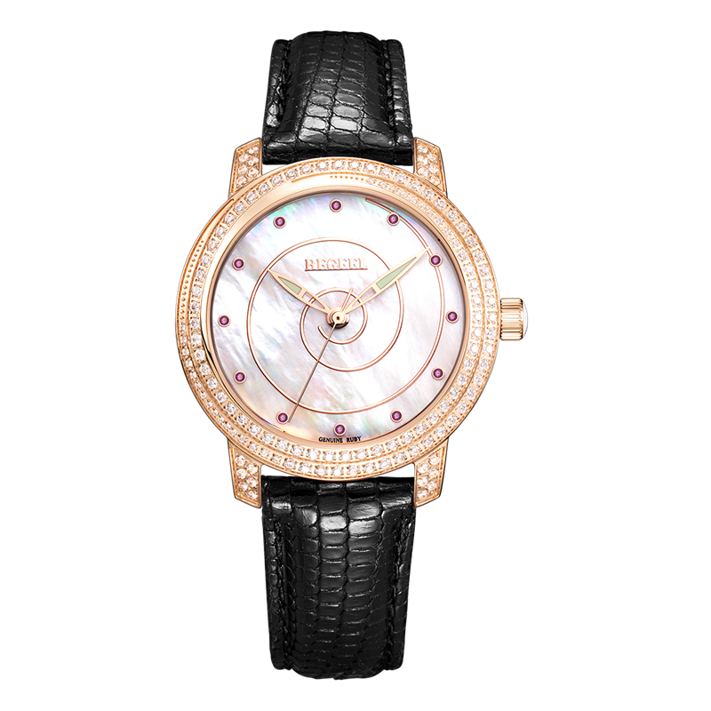 字面:貝殼面12粒真紅寶石刻度/滿天星玫瑰金面鑲329粒水鉆