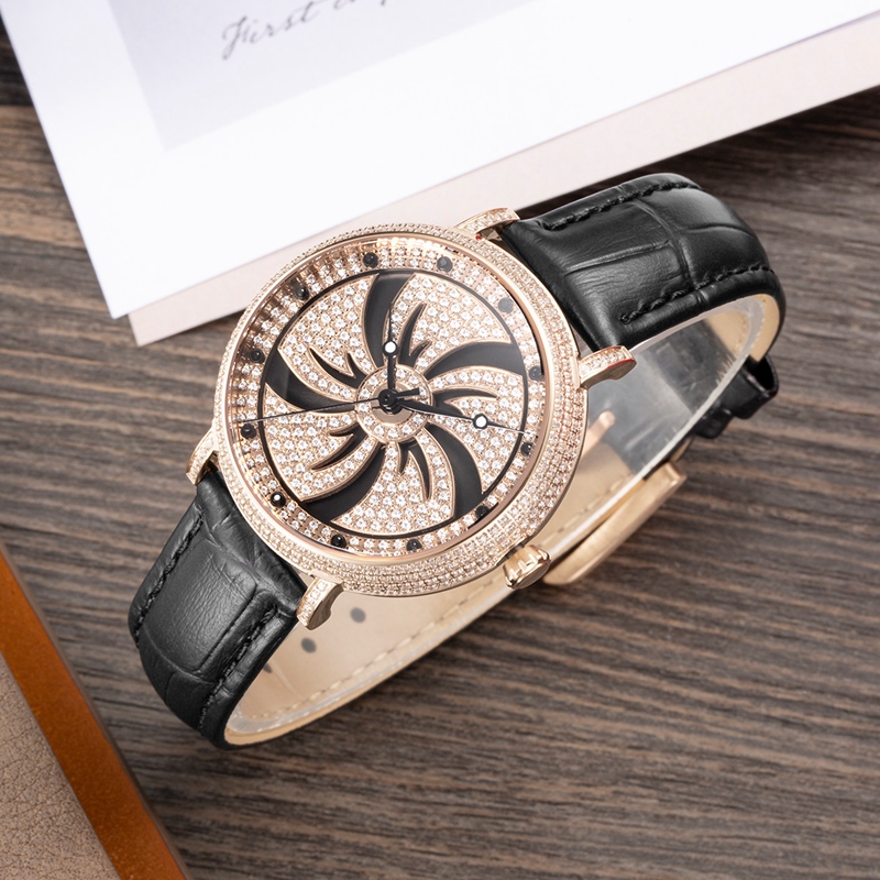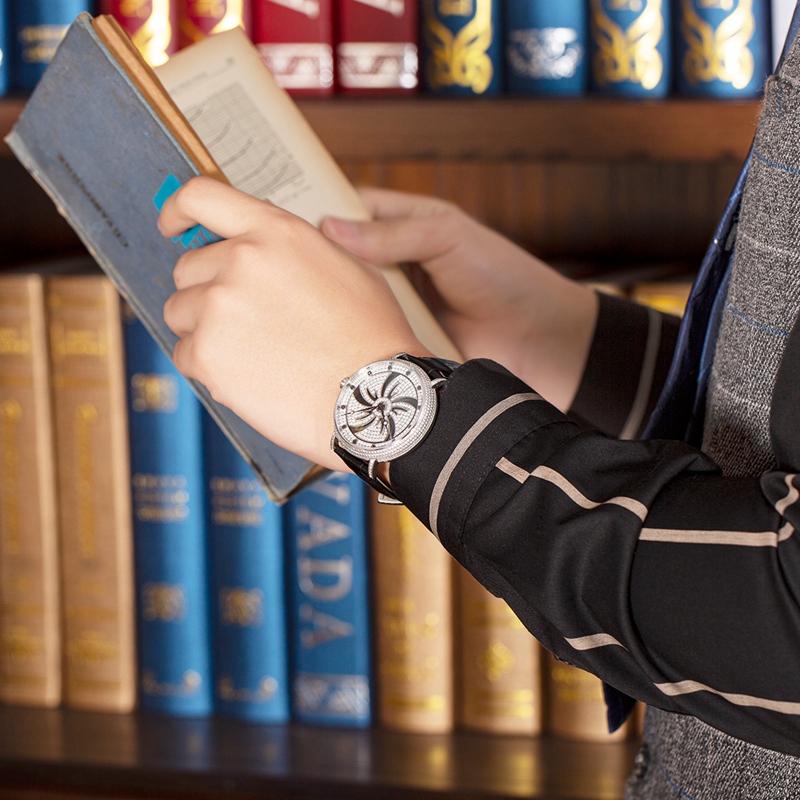 設(shè)計(jì)靈感結(jié)合了時(shí)來運(yùn)轉(zhuǎn)的理念以及宇宙星象運(yùn)轉(zhuǎn)的規(guī)律,創(chuàng)新地設(shè)計(jì)了360°可無限旋轉(zhuǎn)的表盤,并設(shè)計(jì)了以水鉆鑲嵌的滿天星字面、暗合天地人三才思想的星圖字面,再輔以點(diǎn)綴其上的天然黑尖晶石、沙弗萊石,形成一副群星閃耀、光芒四射的宇宙星河美景,手腕抖動(dòng)間表盤隨心轉(zhuǎn)動(dòng),為佩戴者帶來無限好遠(yuǎn)。