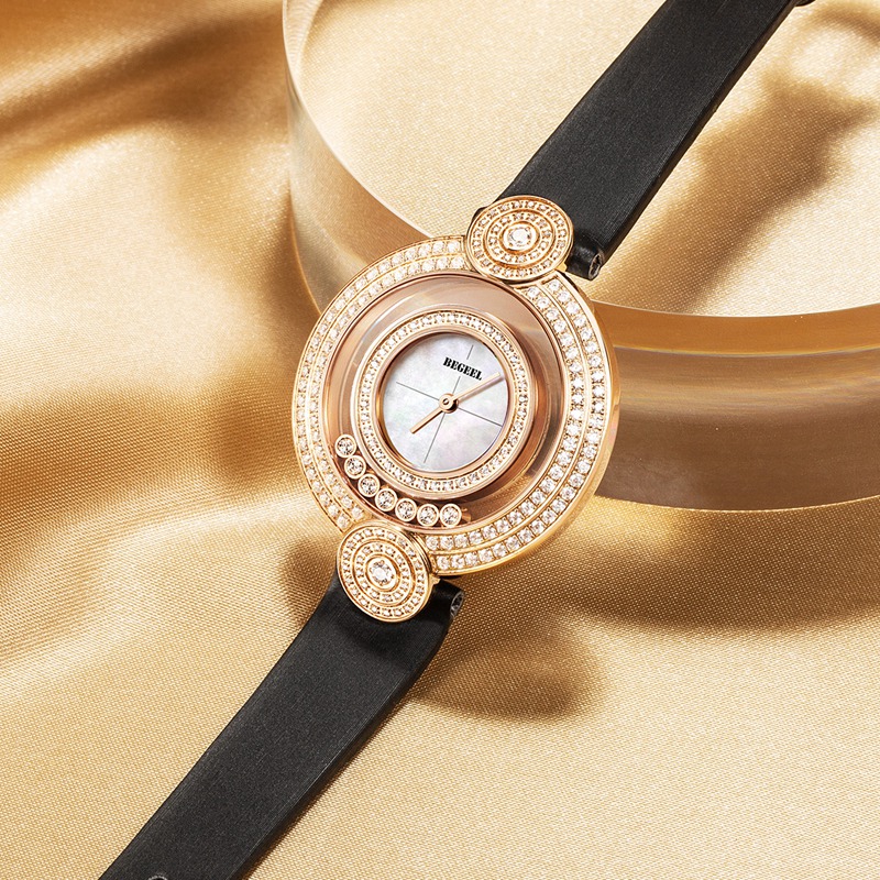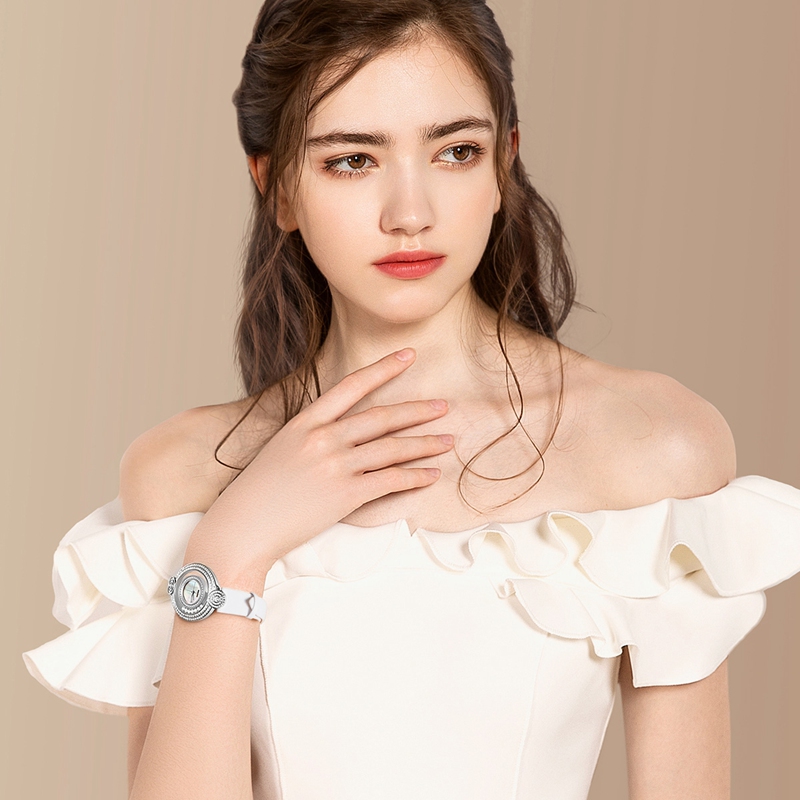 以簡約的線條展示清麗典雅的設計風格,象征繆斯女神的自信與光芒。表盤采用了特有的“鏤空”設計,較小的同心圓為珍珠母貝質(zhì)地,呈圓滿的球型。兩個同心圓環(huán)皆為拋光打造。 兩個圓環(huán)之間、藍寶石水晶鏡面的無形護佑下,七顆靈動水晶鉆如懸空漂浮一般,在流光溢彩的閃爍光華中無盡地回旋、轉(zhuǎn)動。表殼的頂端與底端各綴有一粒單顆水晶鉆,使表殼到豐盈的黑、白色表帶之間的過渡呈現(xiàn)出簡潔、雋永的顯著風格。
