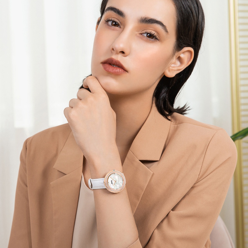 表殼:316L鋼 電鍍玫瑰金, 殼鑲鉆共108顆寶石(上圈口鑲42顆鋯石 中圈口鑲鋯石(44顆)/彩色寶石(18顆剛玉+4顆尖晶+22顆鋯石)底部鑲22顆鋯石)
