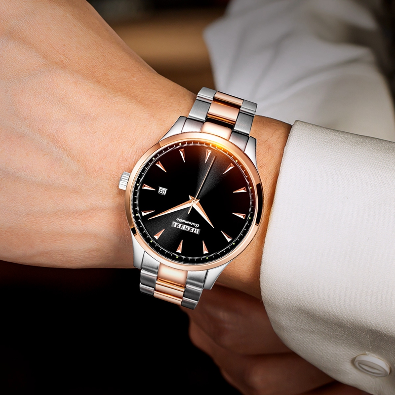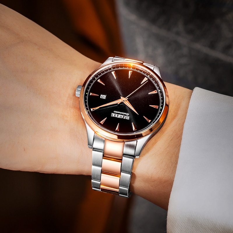 以戰(zhàn)爭中剛毅的守護神為主要設計靈感,整體設計簡潔剛毅,又不乏紳士的儒雅氣質,玫瑰金色搭配精鋼表帶,飾以太陽紋黑色表盤,于男士耀目的氣質中增添一抹銳氣與沉穩(wěn),傳遞出大氣與堅毅的守護者力量,自信展示真我的型男魅力。
