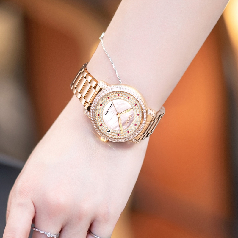 表殼:316L精鋼電鍍玫瑰金,鑲螺旋鉆圈口,鑲111顆晶鉆