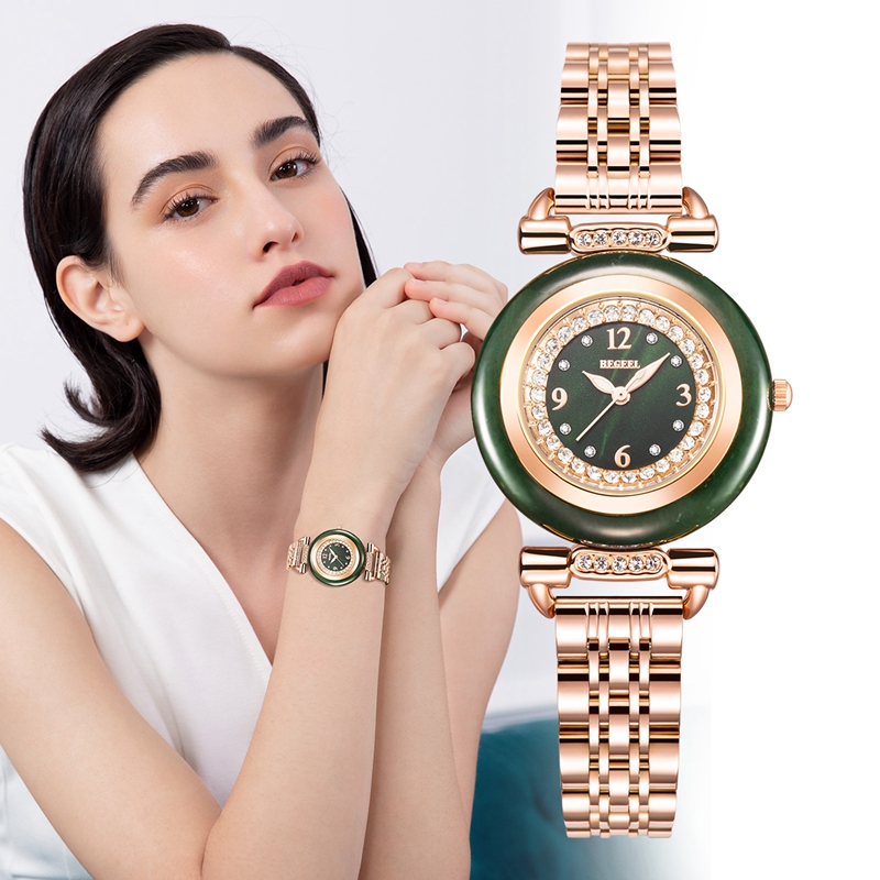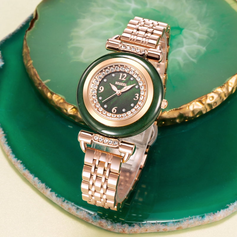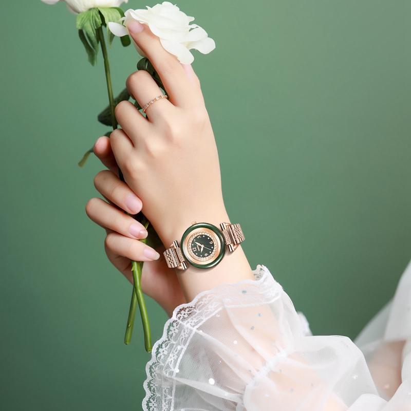 表殼:墨綠和田玉圈,電鍍玫瑰金,鑲嵌40顆晶鉆