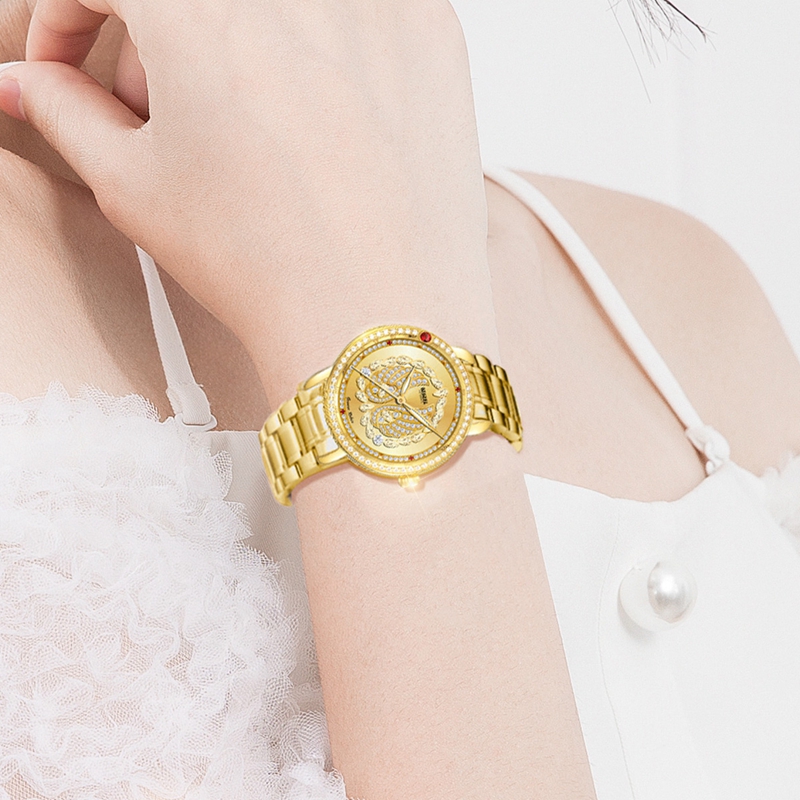 表殼:316L精鋼電鍍金,鑲57顆晶鉆,1顆合成大紅寶石