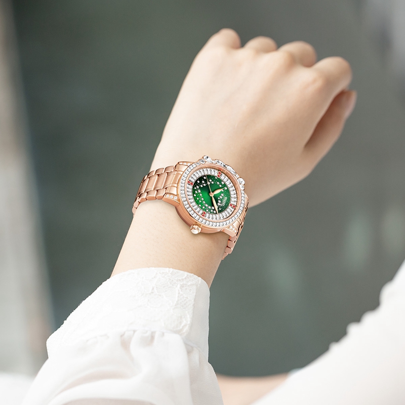 表殼:316L精鋼+電鍍真玫瑰金,圈口鑲59顆晶鉆