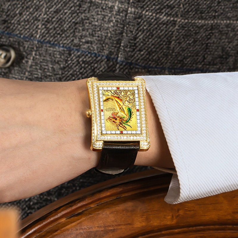 字面:電鍍青龍面, 雙紋理設(shè)計(jì)海浪和風(fēng)紋+鑲36顆晶鉆方石+4顆真紅寶石
